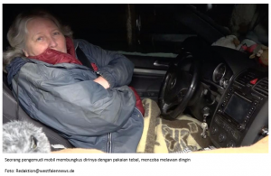 Seorang pengemudi mobil membungkus dirinya dengan pakaian tebal, mencoba melawan dingin